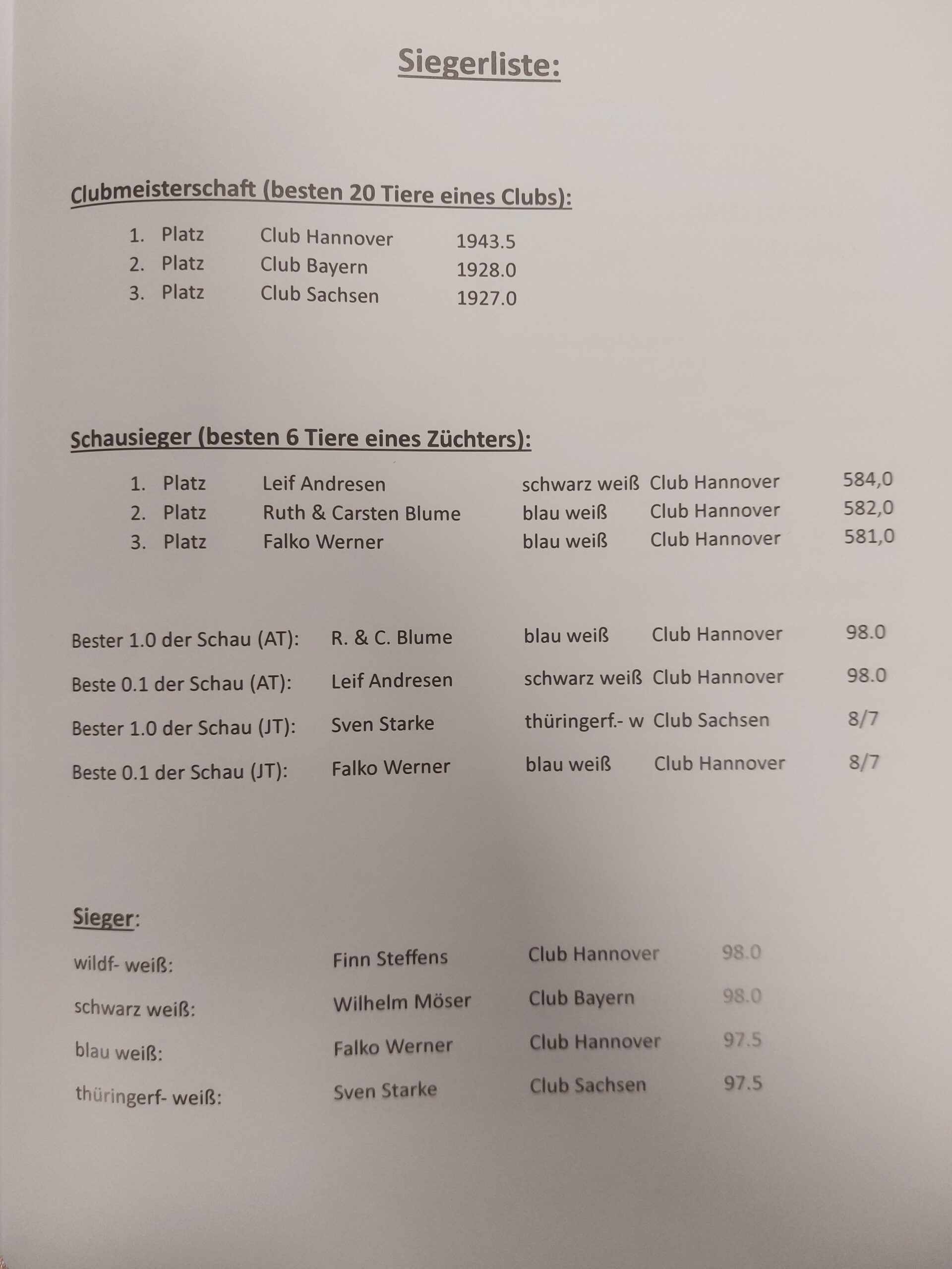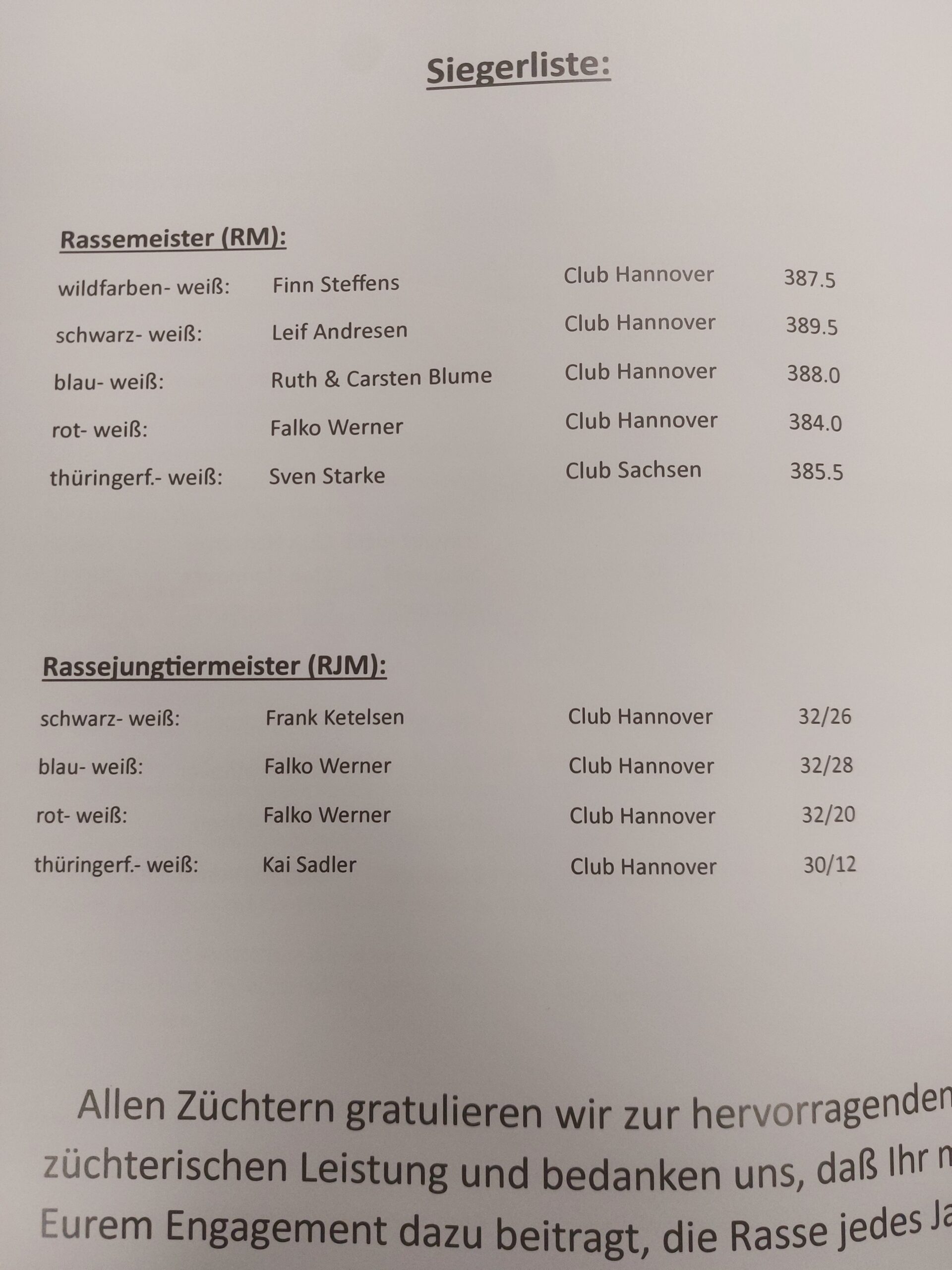Die Schau findet auf dem Betriebshof von Falko Werner Garten- und Landschaftsbau in 31036 Eime (Schachthof 2) statt. Mit 222 Rassevertretern sind alle Farbschläge vertreten. Dabei sind auch die bisherigen Zuchterfolge einiger Rassevertreter des im Neuzuchtverfahren befindlichen havannafarbig-weißen Farbschlags zu sehen.
