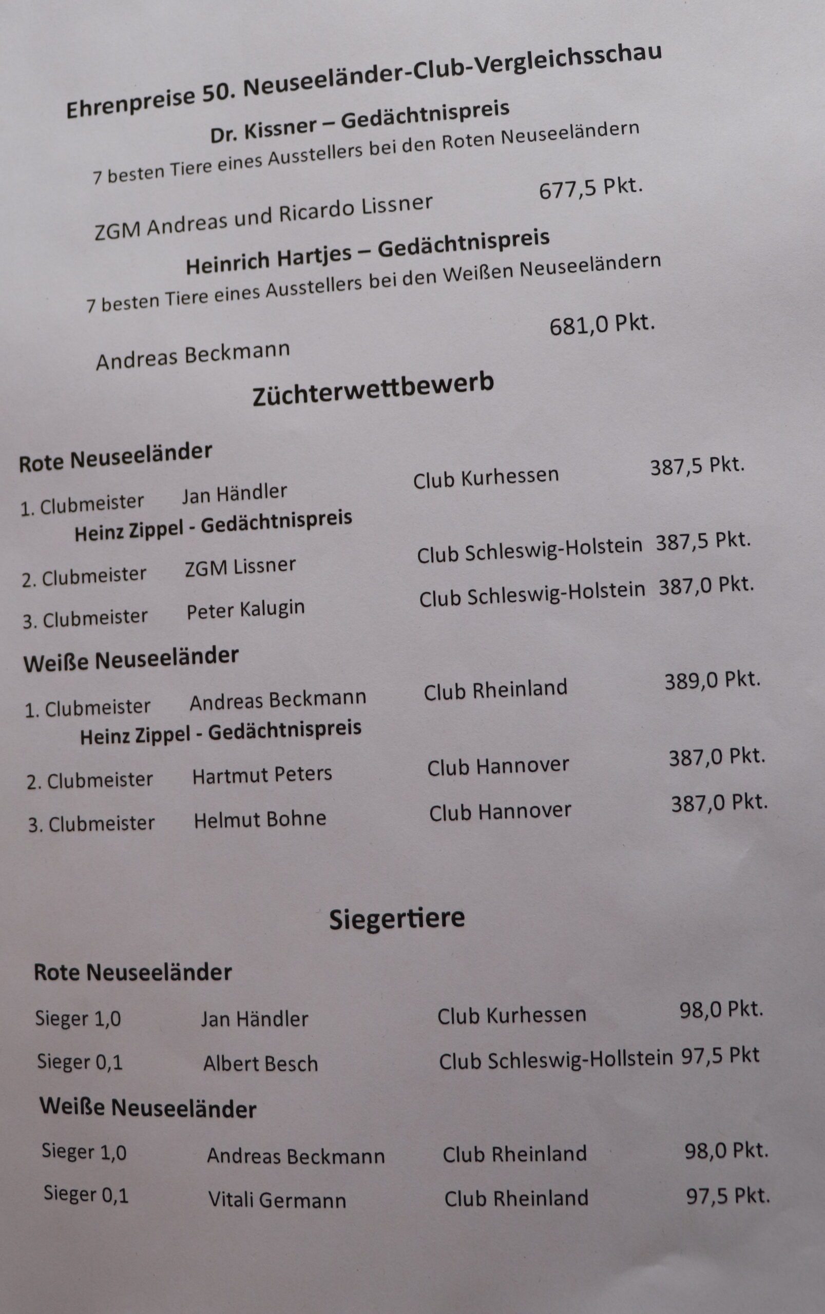 Am 19./20. Oktober 2024 fand in der Agrar eG „Wöllmisse“ die 50. Neuseeländer-Club-Vergleichsschau als „Heinz-Zippel-Gedächtnisschau“ statt. Dabei waren rund 500 Weiße und Rote Neuseeländer zu sehen.