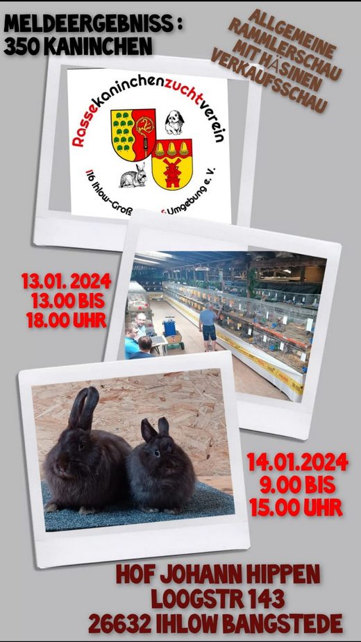 Am 13./14. Januar 2024 findet beim KZV I 16 Ihlow Großefehn die diesjährige Allgemeine Rammlerschau mit angeschlossener Häsinnen-Verkaufsschau statt. Die Schau findet statt auf dem Hof Johann Hippen, Loogstr. 143, 26632 Ihlow Bangstede.