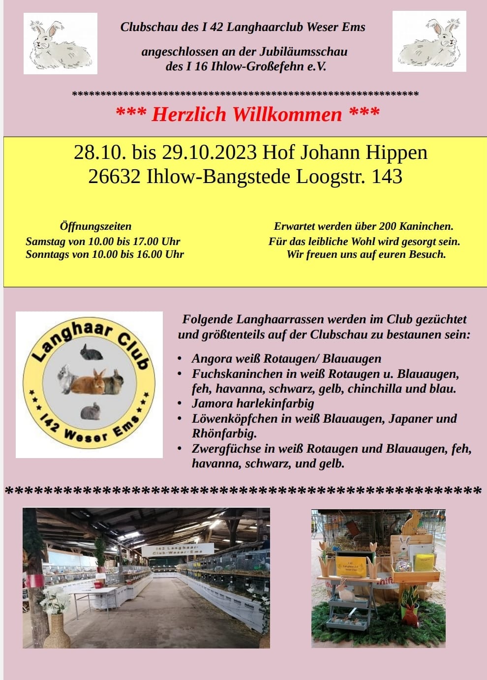Am 28./29. Oktober 2023 findet auf dem Hof Johann Hippen (Loogstr. 143, 26632 Ihlow-Bangstede) die Clubschau des I 42 Langhaar-Club Weser-Ems statt. Angeschlossen ist die Jubiläumsschau des KZV I 16 Ihlow-Großefehn.
